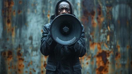 Young activist in a protest, shouting in a megaphone. Demonstration