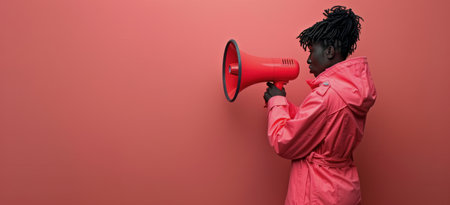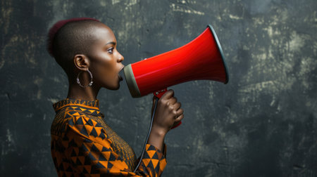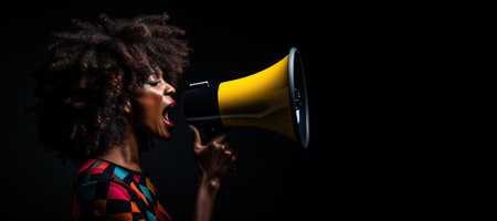 Generative AI, Studio shot of African woman using a megaphone against a black background, a powerful statement