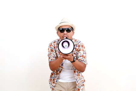 Asian adult man tourist holding a megaphone while screaming. Concept of travel. Isolated on white