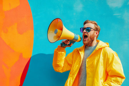 Young man holding a megaphone and shouting with a colorful wall in the background
