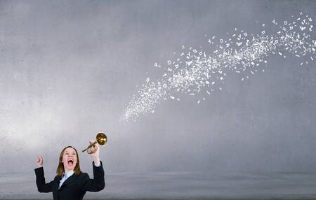Cheerful man shouting, screaming through a megaphone, announcing something news, announcments concept