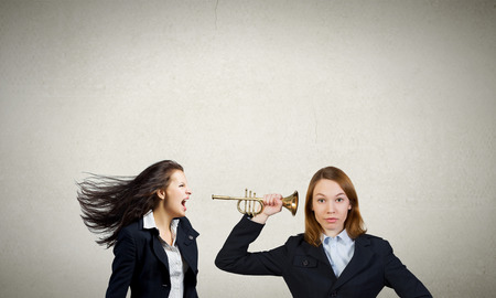 Humorous portrait of an emotional man with a megaphone for trendy magazine style flyer design