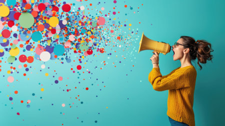 Woman with megaphone projecting colorful abstract shapes against turquoise background