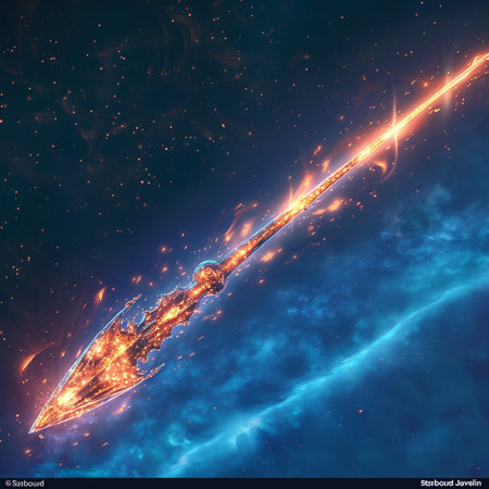 Detailed illustration of an arrow. The arrow is adorned with intricate gold ornamentation and fiery orange feathers. It is positioned amidst swirling dark blue waves and clouds, creating a rich and dynamic visual composition. The background is a deep black, further enhancing the visual impact of the arrow.