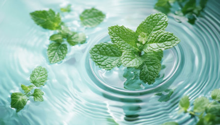 Light blue water ripples with mint leaves and a bowl on top, with a light reflection. --ar 53:30 --v 6.1 Job ID: db241fc7-c4c3-430f-af02-38652a432745