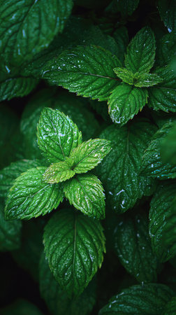 Close-up of vibrant green mint leaves covered in dew drops, set against a dark background.