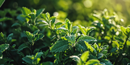 Lush green mint leaves glisten in natural sunlight, showcasing their textured surface and vibrant color. Perfect for culinary and herbal themes.