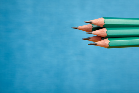 Group of five identical simple pencils in a wooden shell with a graphite rod, on blue backdrop.