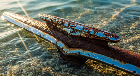 A captivating underwater scene showcasing a spear casting elongated shadows, surrounded by stunning circles of light. The tranquil blue water creates a mysterious and serene atmosphere, perfect for nature and exploration themes.