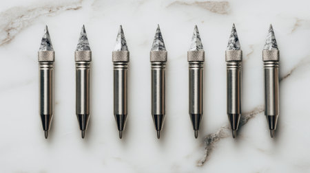 A collection of elegant metallic pens featuring marble tips, arranged neatly on a light marble surface, ideal for office styling and chic stationery concepts.