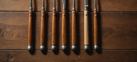 Set of wooden kitchen knives on a wooden background. Top view.