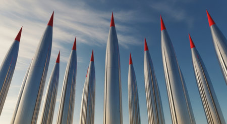Multiple towering metallic bullet shaped structures with sharp red tips pointing upwards against a clear blue sky. symbolizes power, defense, ambition, and technology.