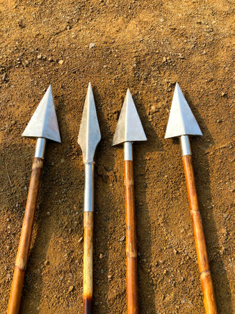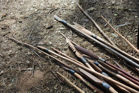 LAURA,QLD - JULY 08 2023:Aboriginal Australians weapons on the ground.Spears used for hunting, fishing, fighting, retribution, ceremony, as commodities for trade and as symbolic markers of masculinity