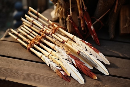 close-up of wooden arrows with natural fletching, created with generative ai