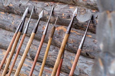 Retro spears stand against the wall of an old house