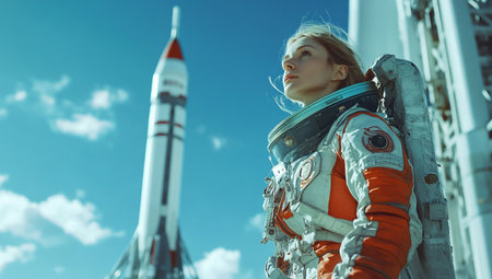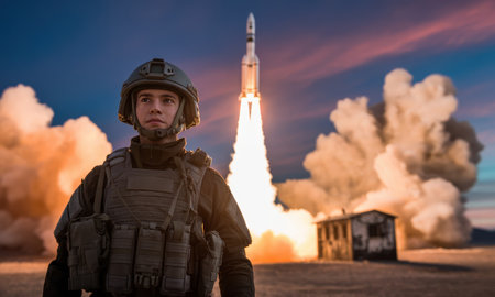 Young male soldier in tactical gear and helmet stands with a determined expression, a powerful rocket launching in the background. Represents military strength, space exploration, advanced technology, and future defense.