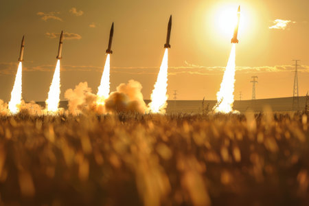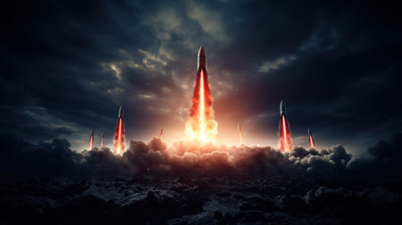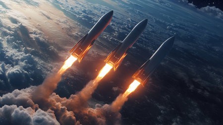 Four powerful rockets ascend into a dramatic twilight sky, leaving trails of fiery exhaust. concept of space exploration, military power, and advanced technology.