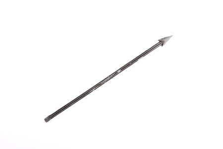 Ancient spear with sharp metal tip and ornate bronze accents on a wooden shaft on white background