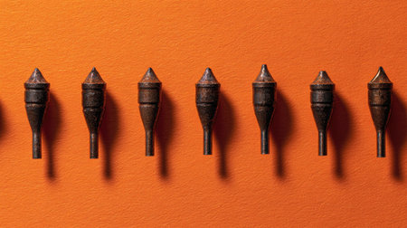 A captivating arrangement of vintage brown metal craft tools displayed against a vibrant orange background, perfect for enhancing creative projects and artistic themes.