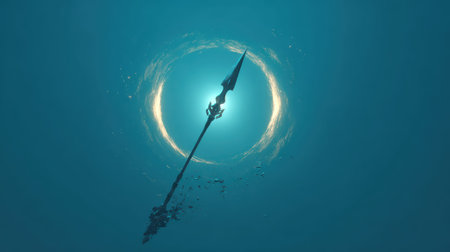 A captivating underwater scene showcasing a spear casting elongated shadows, surrounded by stunning circles of light. The tranquil blue water creates a mysterious and serene atmosphere, perfect for nature and exploration themes.