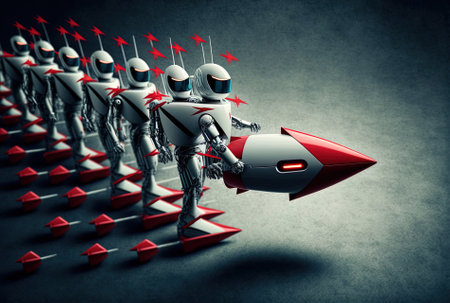 missile aiming upward, highcontrast scene showing missile with seeker tip and aerodynamic features