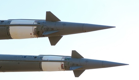 Belgrade, Serbia - September 2, 2012: Russian V-600 surface to air missiles on the S-125 quadruple launcher. This missile system was designed by Aleksei Isaev and have operational range of 35 kilometres.