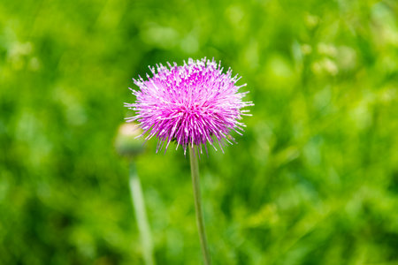 Cirsium vulgare blooms in summer in a garden meadow with a single flower, blurred background
