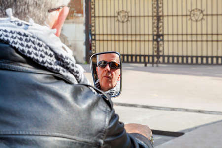 Vertical color portrait of face reflection of a caucasion motorbiker in a rear view mirror waiting at car park gates to open, Generic shot location Bombay India with model release