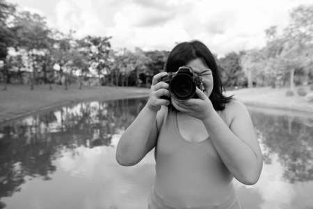 Beautiful overweight Asian woman relaxing at the park in the city