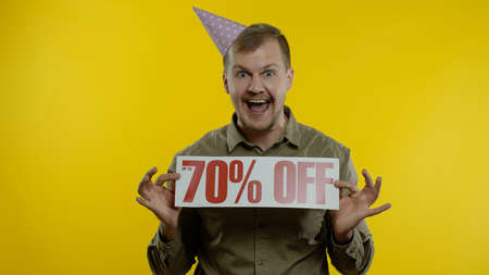 Great discounts. Happy joyful man in festive cap showing Up To 70 percent Off purchase inscription, looking satisfied with purchase. Online shopping with low prices, Black Friday concept