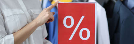 Woman holding sign with designation of discount in store closeup