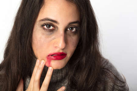 Beaten woman standing in front of a dark wall demonstrating violence on women