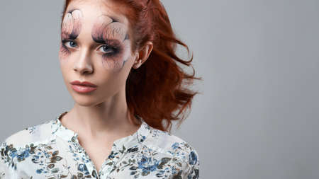 red-haired girl with artistic make-up on gray