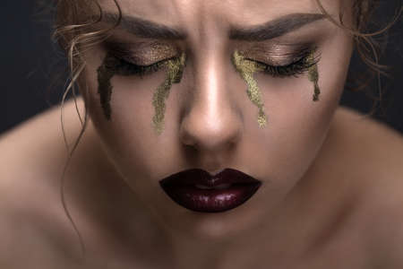 Art beauty close-up portrait of a beautiful model with curly hair. Creative make-up in the style of gold that drain tears from the eyes.