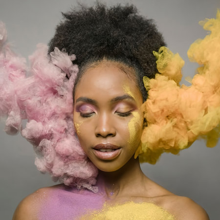 Black woman posing with pink and yellow powder