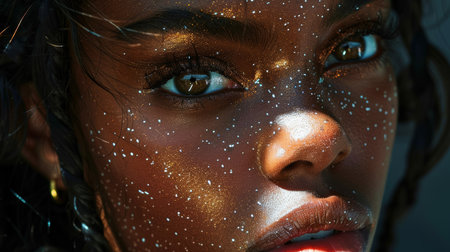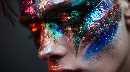Close up of person eyes showcasing vibrant makeup with glitter and shimmering colors. skin glistens under light, creating captivating and artistic look that emphasizes beauty and creativity
