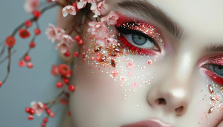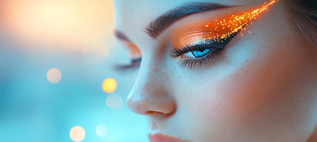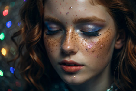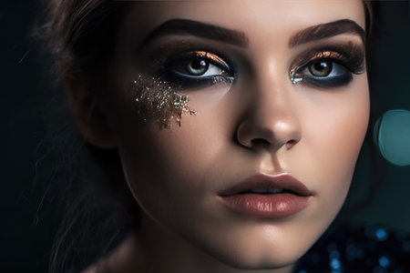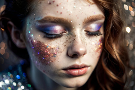 Closeup portrait of a beautiful young woman with bright make-up and glitter on her face.