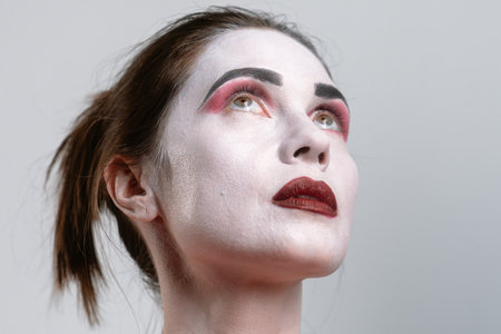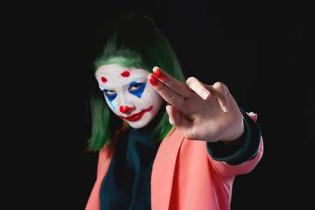 Closeup photo shoot of spooky girl with evil clown makeup at dark photo studio.