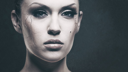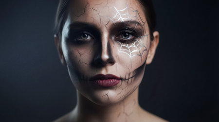 Portrait of woman with spooky spiderweb and cracked skin makeup.