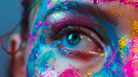 Vibrant close-up of an eye surrounded by bright, colorful paint splashes, symbolizing creativity, art, and self-expression in a surreal style.