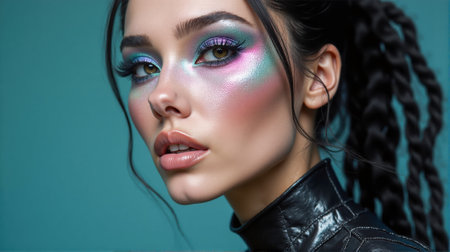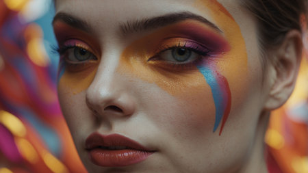 A fashion model displays captivating makeup featuring bright colors and unique highlights. The model's hairstyle complements the artistic look, set against a bold background.