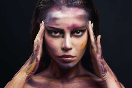 Fashion and make-up concept. Close-up portrait of an attractive young woman with creative makeup and body painting. Dark background.