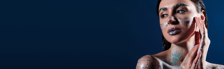 portrait of young woman with glitter on body touching face isolated on blue, banner