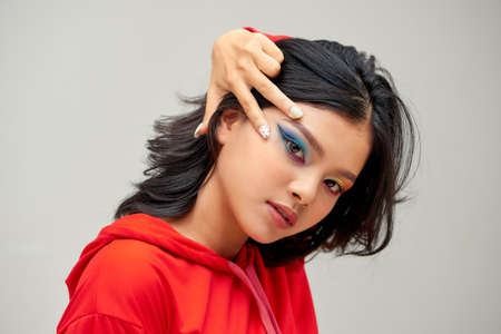 beautiful young girl model with bright red makeup.