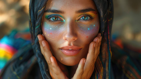 A whimsical portrait of a person adorned with glittering accents on their cheekbones the bright hues reflecting warm sunlight. Their eyelids sparkle with a cascade of vibrant.