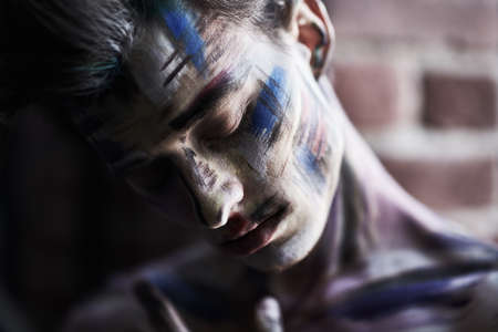 Close-up portrait of a masculine man with painted face standing with his head bowed and his eyes closed on a brick wall background. Art, people, emotions.