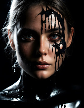 A woman with striking blue eyes is depicted with glossy black paint dripping like tears down her face. The contrasting dark liquid on her fair skin creates a mesmerizing and hauntingly beautiful effect.