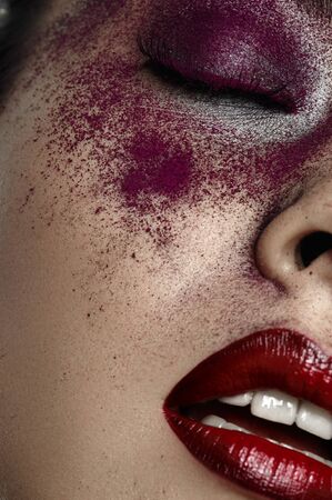 Beautiful female Model with red Lips and purple Makeup on closed Eyes