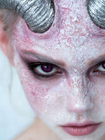 A woman with a white face and silver makeup on her eyes, AI