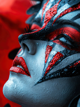 Close-up of a woman's face with artistic makeup, red and black patterns